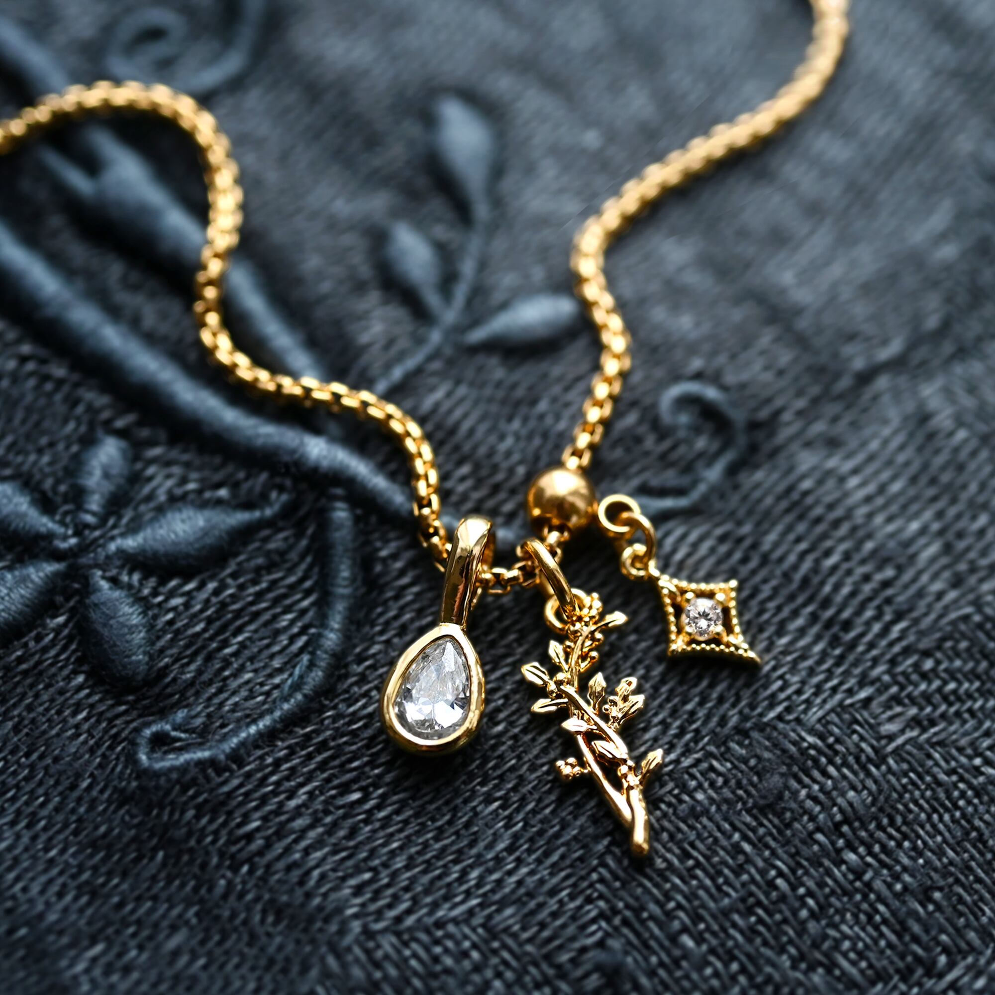 静寂に包まれた森で道標となる光をイメージした3つのチャームが、胸元で物語を紡ぎます。
