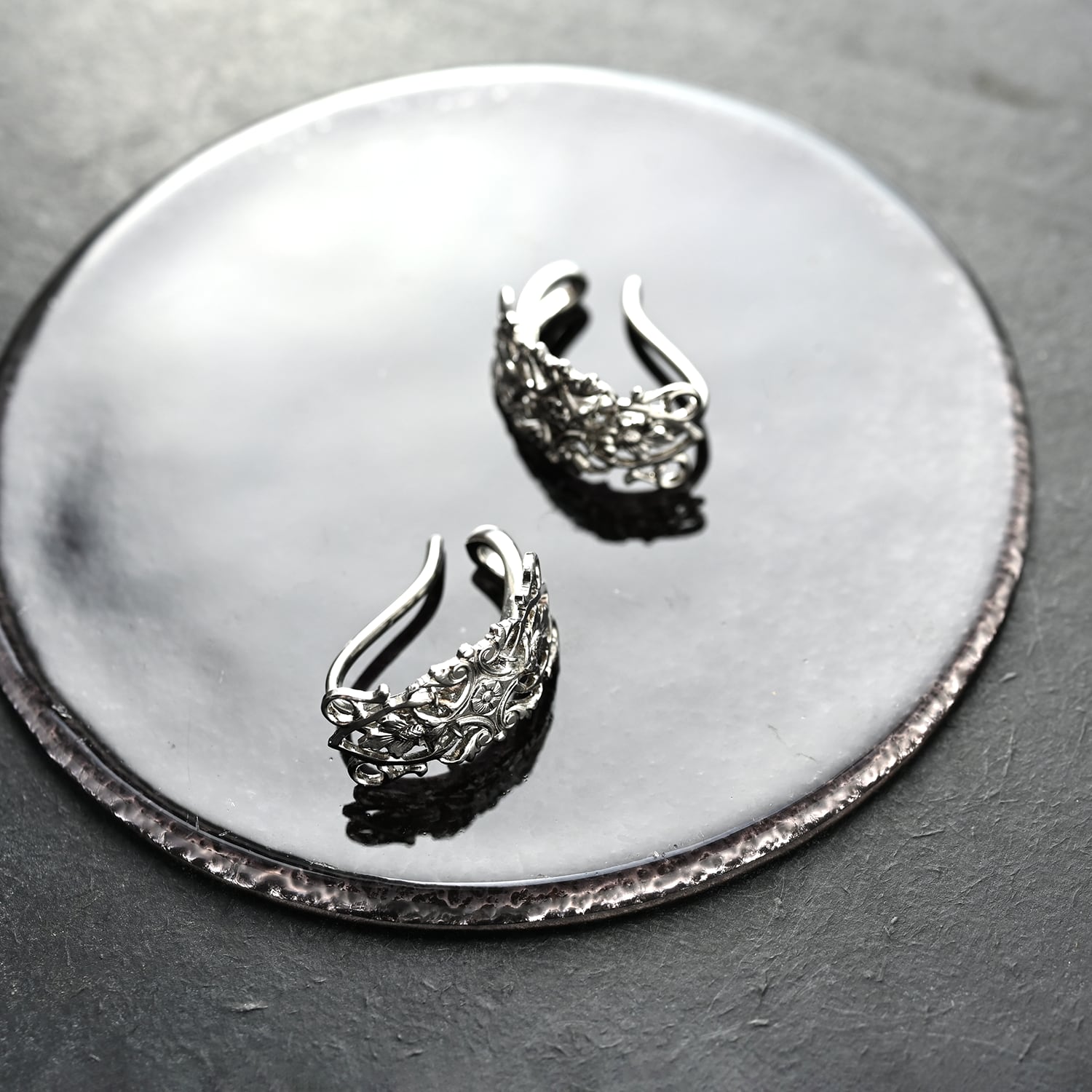 真鍮製のヴィンテージパーツにロジウムメッキ加工を施し、現代的なスタイルに溶け込むイヤーカフに仕上げました。