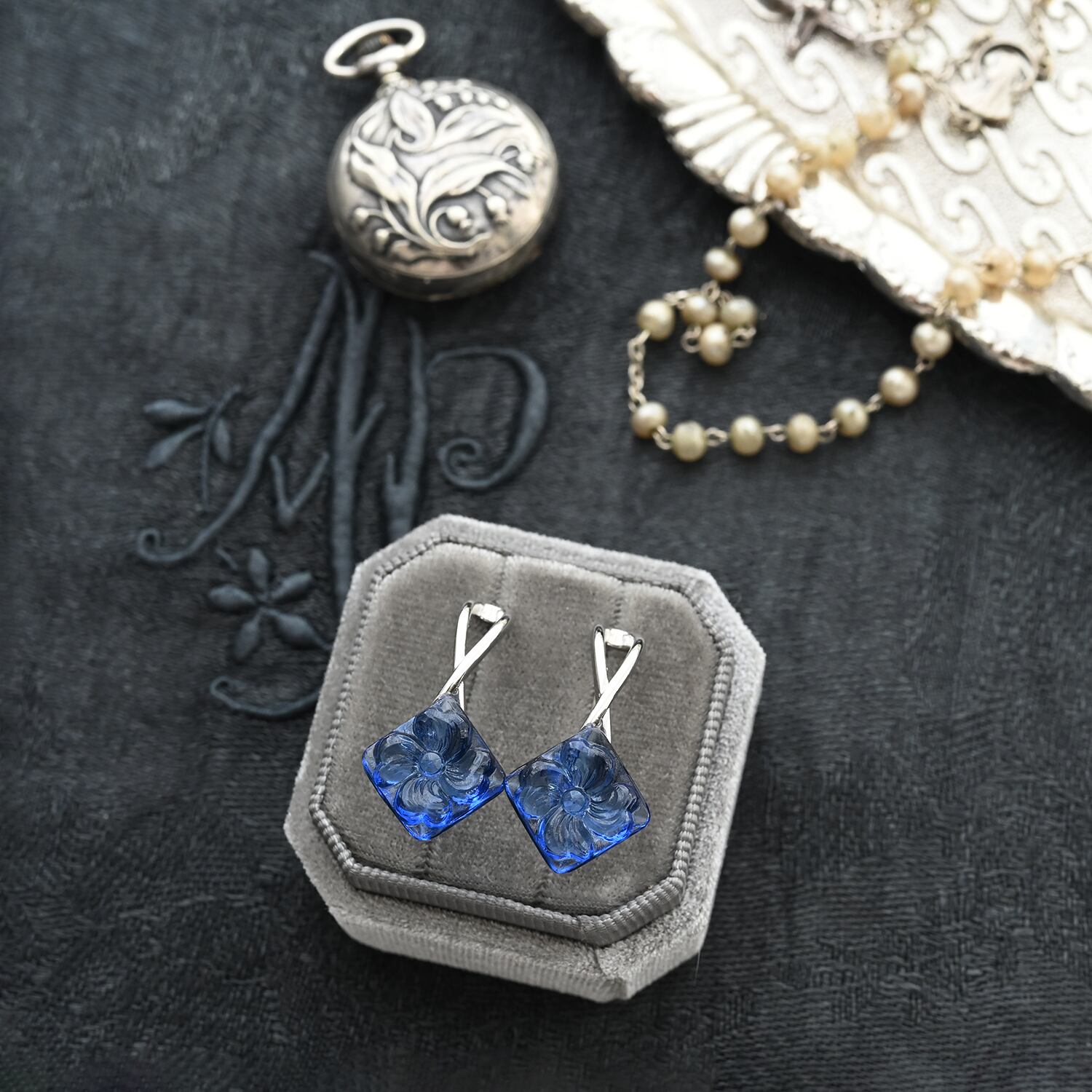 2個セット|ヴィンテージガラスのイヤーカフ[スクエアフラワー・ネイビー]