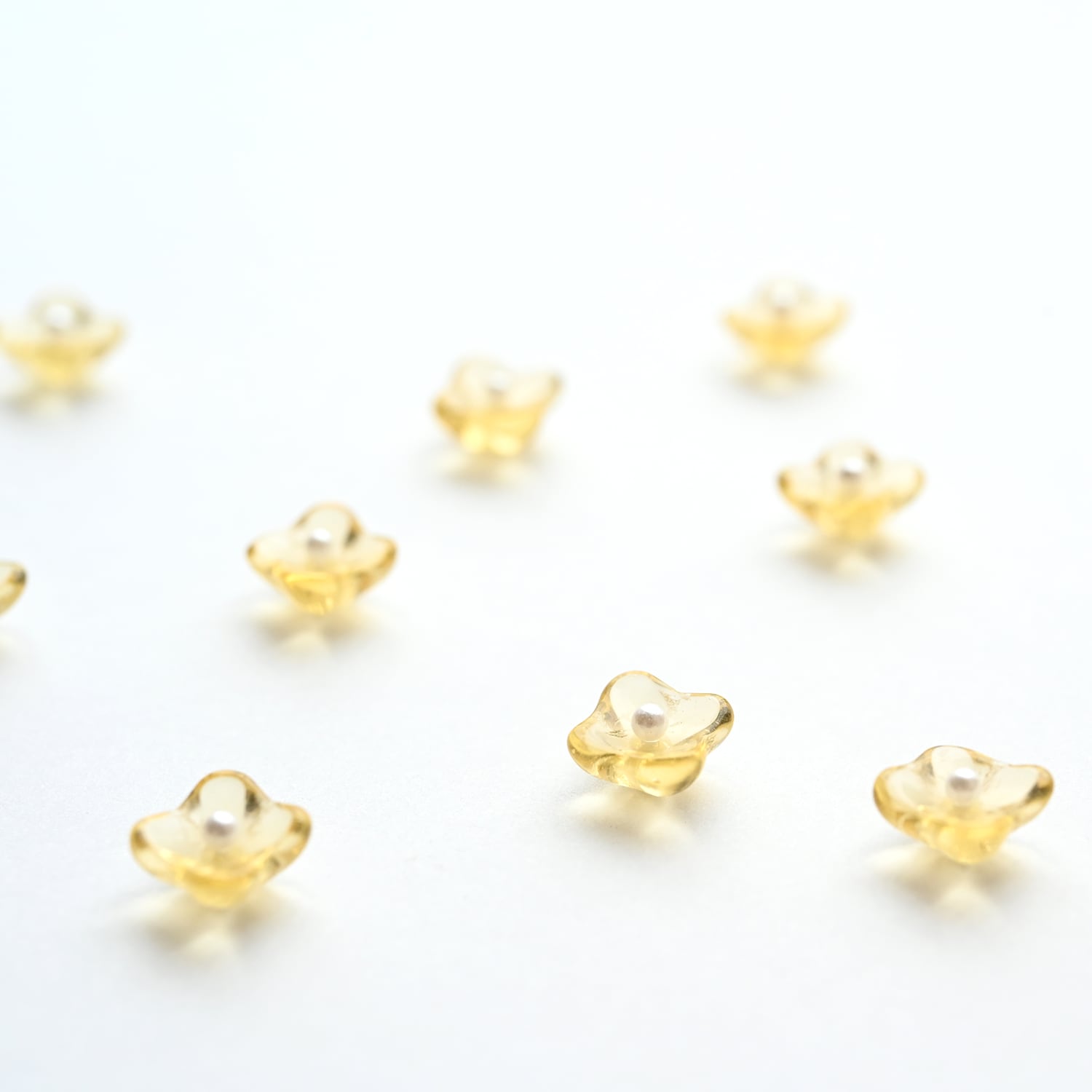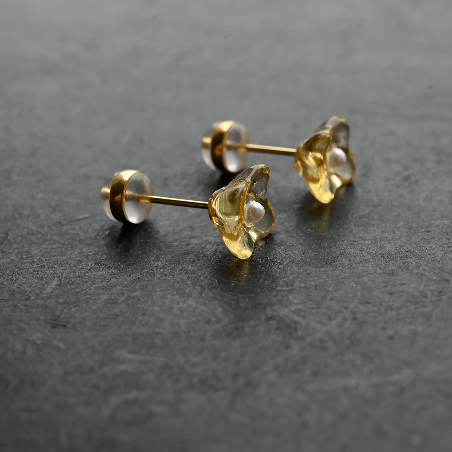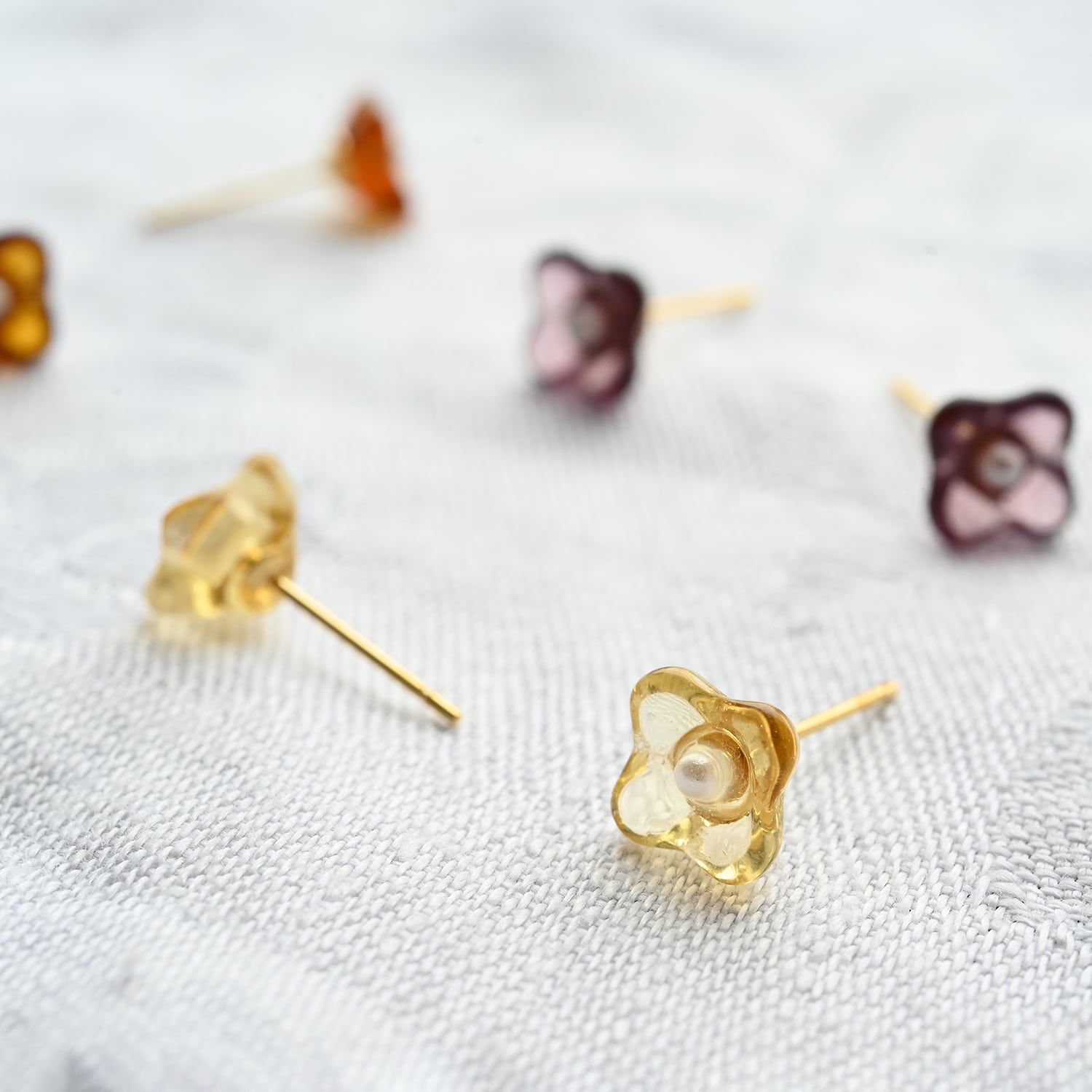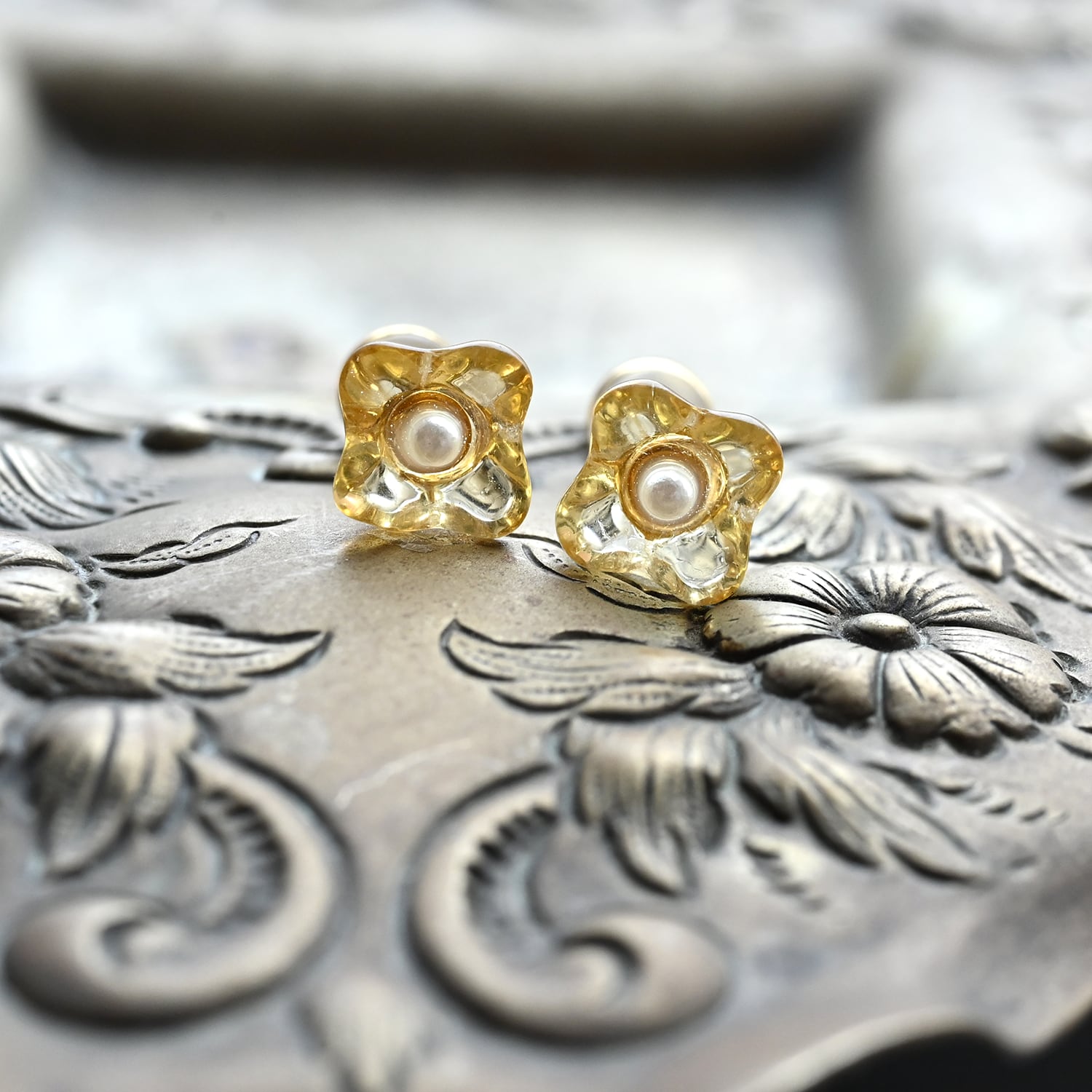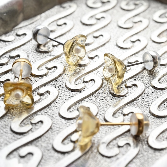 ヴィンテージガラスとパール|小さな花のピアス/ノンホールピアス[ハニーイエロー]