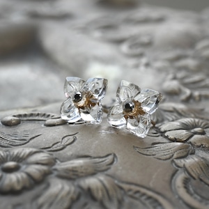 繊細で可憐な佇まいの透明な小花ピアスです。