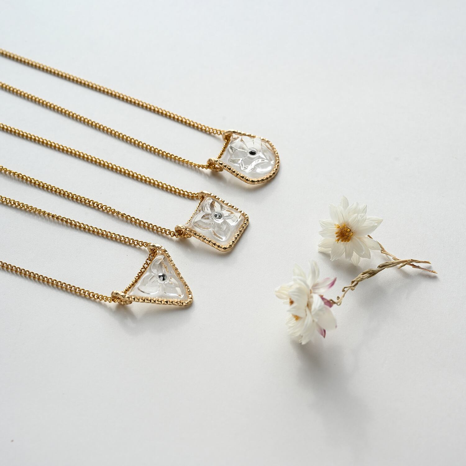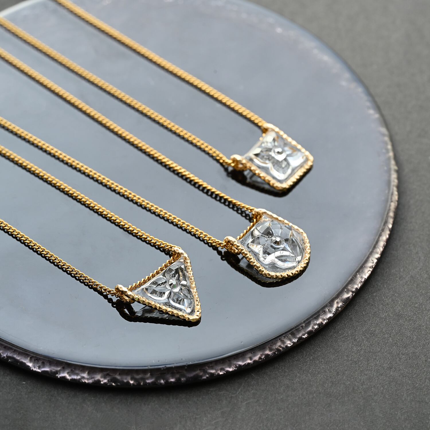 縁取りのカットがアクセントとなり、無垢のゴールドに劣らない上質な輝きは首元に高級感と洗練された印象をもたらします。