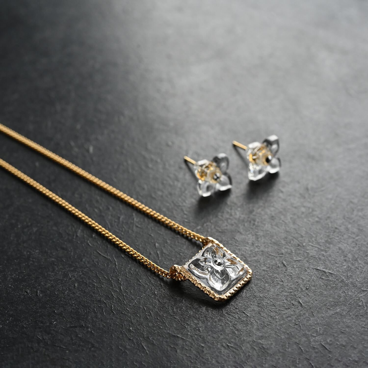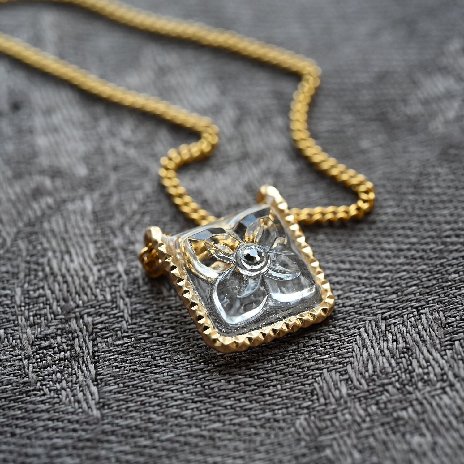 ヴィンテージガラスの透明な花ネックレス[Aスクエア・ゴールド]金属アレルギー対応